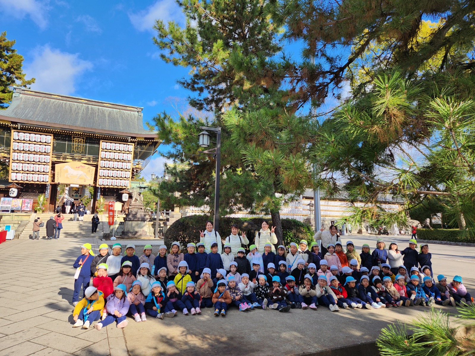 新年、最初の遠足は北野天満宮でした。つつじ組、ふじ組のお友達と一緒に行きましたよ。 参道を少し歩くと、撫牛がありました。早く走れるようになりたいお友達は足を、ご飯をたくさん食べたいお友達はお腹を、力持ちにになりたいお友達は腕を、と一人ひとりが願いを込めて撫でている姿が見られました。 その後はふじ組さんから参拝の仕方を教えてもらい、神様にご挨拶をしましたよ。 今年一年も、笑顔いっぱい健康に楽しく過ごせますように、、