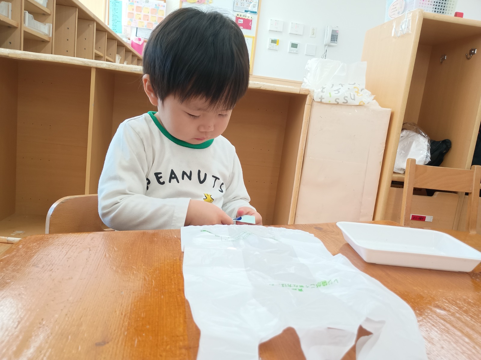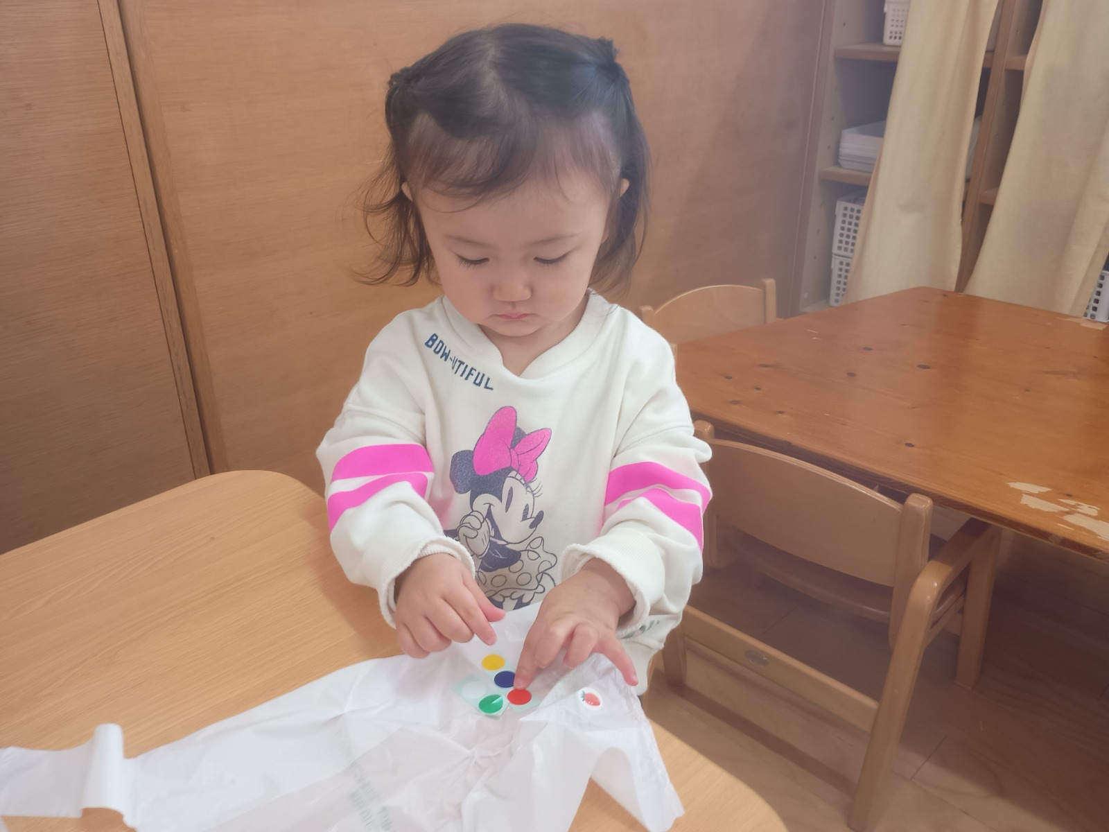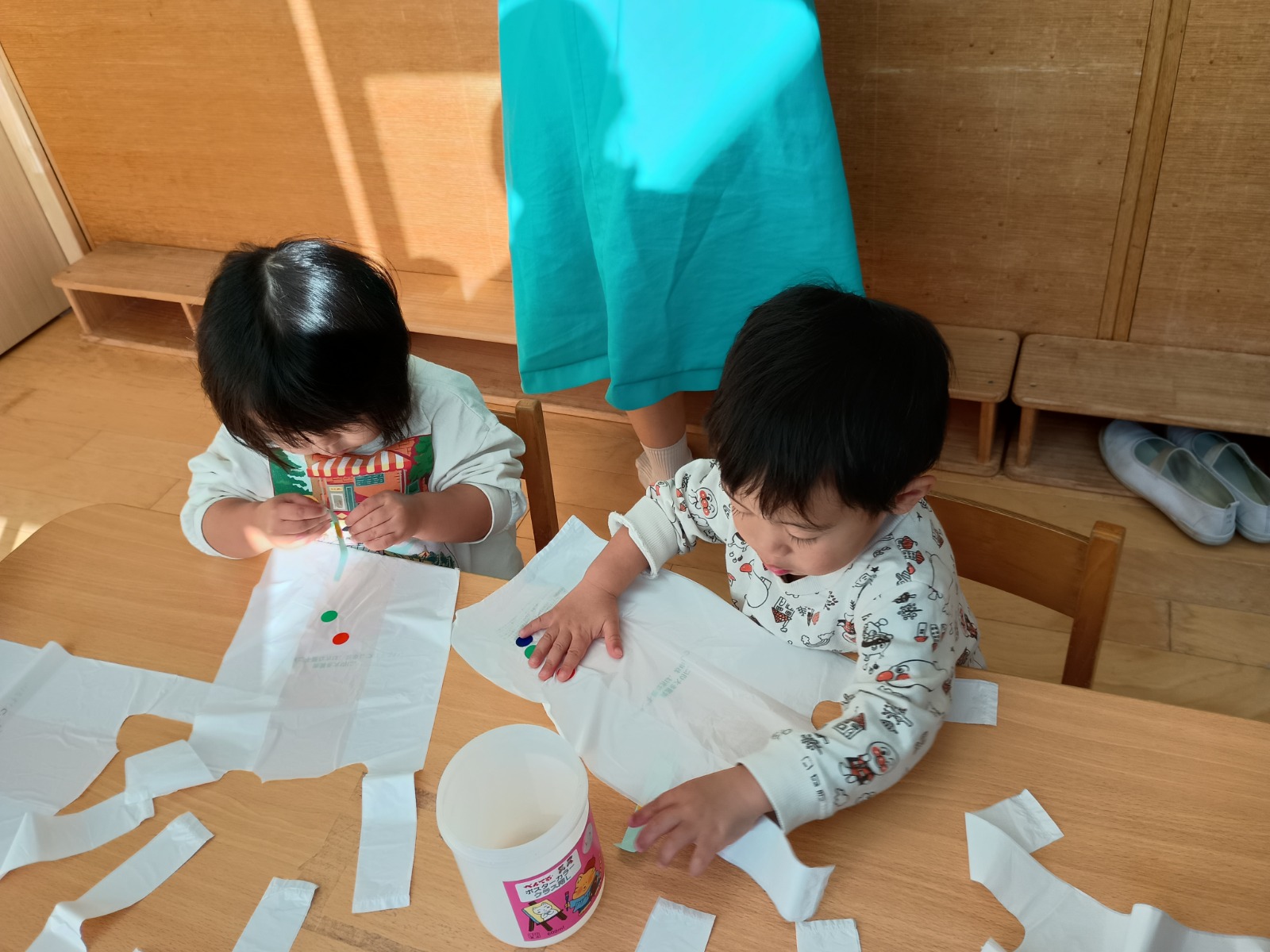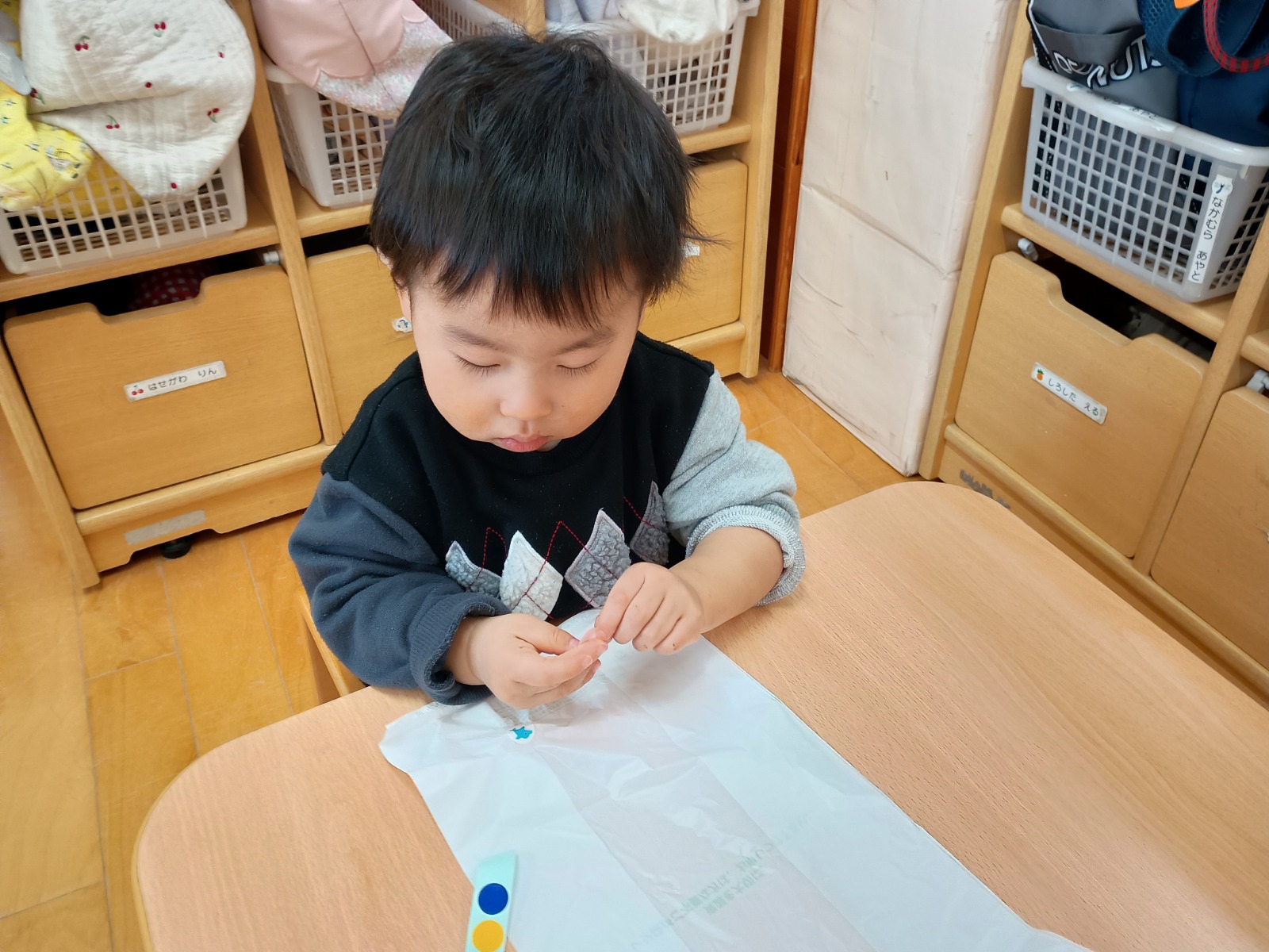 ビニール袋をたこに見立て、丸シールで模様付け、スズランテープを足にしました。小さな丸シールをはがすのは少し難しかったけど、先生に手伝ってもらいながら可愛い凧ができたよ!完成した凧で、クラスみんなで凧揚げを楽しみましたよ✨