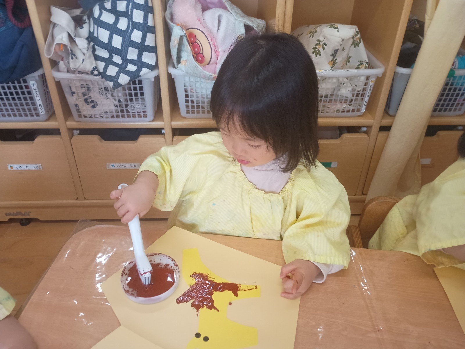 今年は午年なので、画用紙でかたどったうまに絵の具で模様を付けて絵馬に貼り付けました。模様付けでは、初めてブラシを使いました!