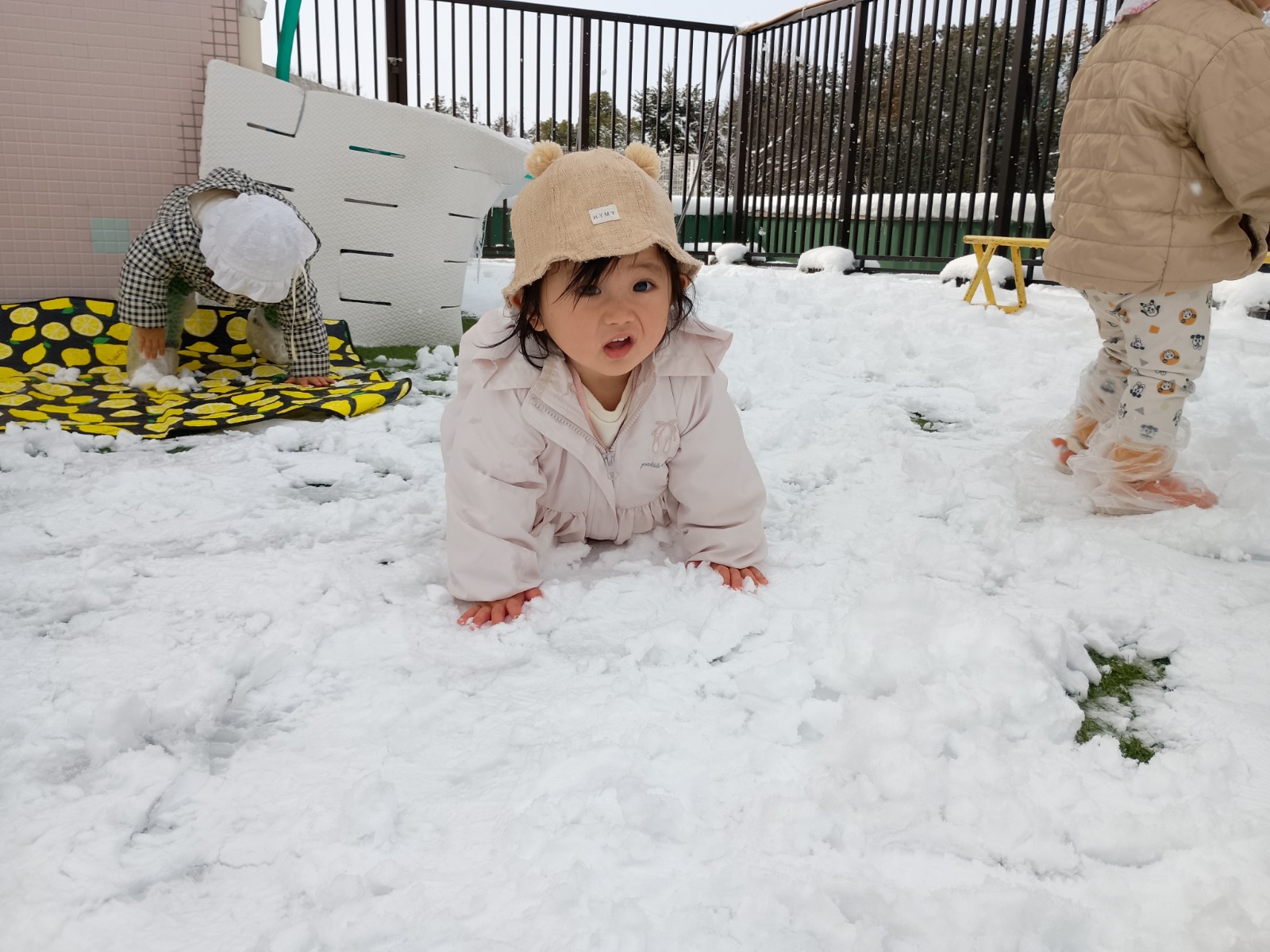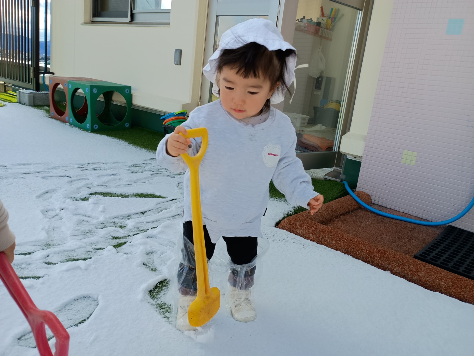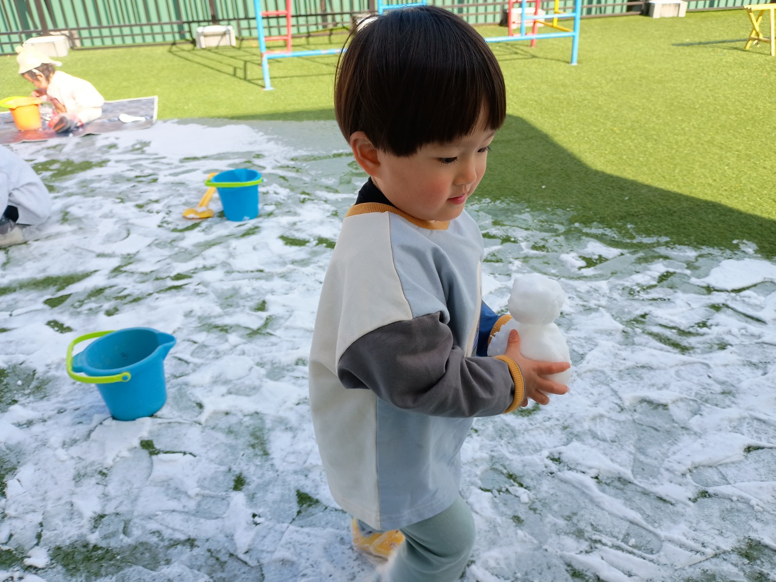 この冬2回、幼稚園にたくさんの雪がつもりました!屋上や上園庭で雪遊びをしましたよ。 足で踏みしめると「ギュッギュッ」と音がするのが面白くて、トコトコとあちこちに足跡をつけて歩いていました。 触ると冷たくてビックリしていましたが、手形をつけたり、丸めたり、振り払ったりして楽しんでいました。雪だるまを先生が作ったのをみたり、雪合戦で遊んだり、色々楽しみました。最後は冷たくて、寒くて「もうおしまい!」と終わっていました(⌒∇⌒) 冬ならではの遊びを楽しめて良かったです!