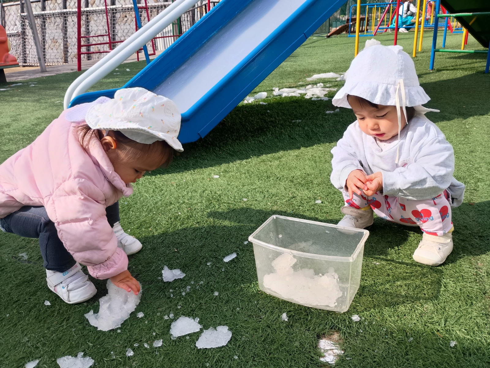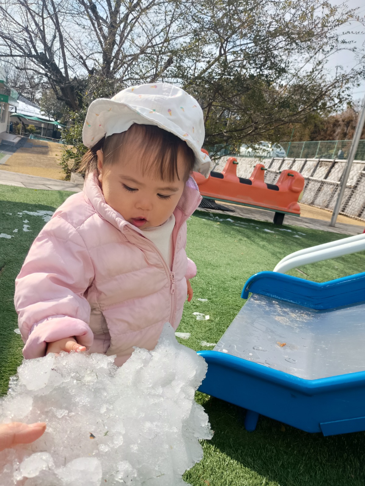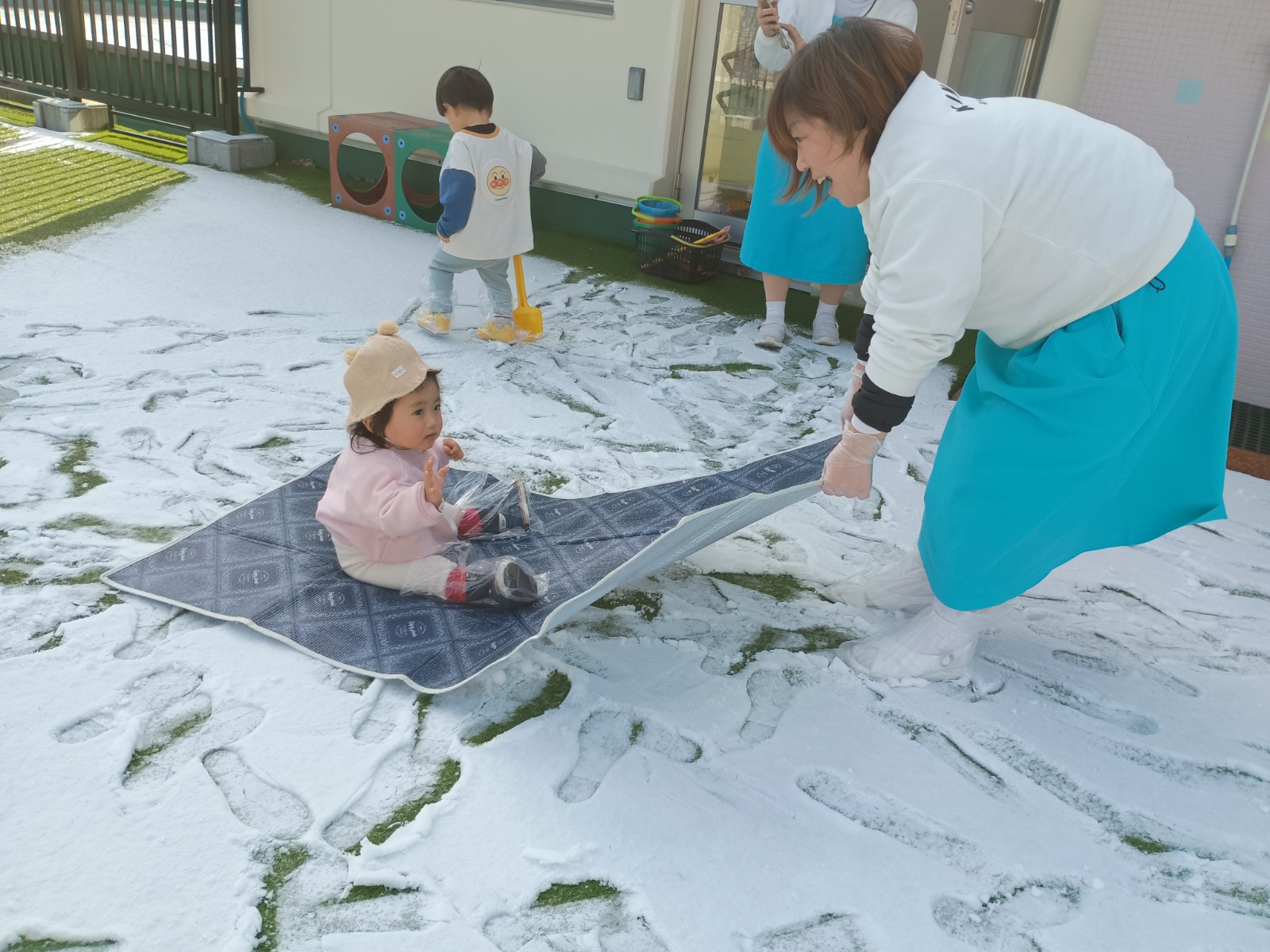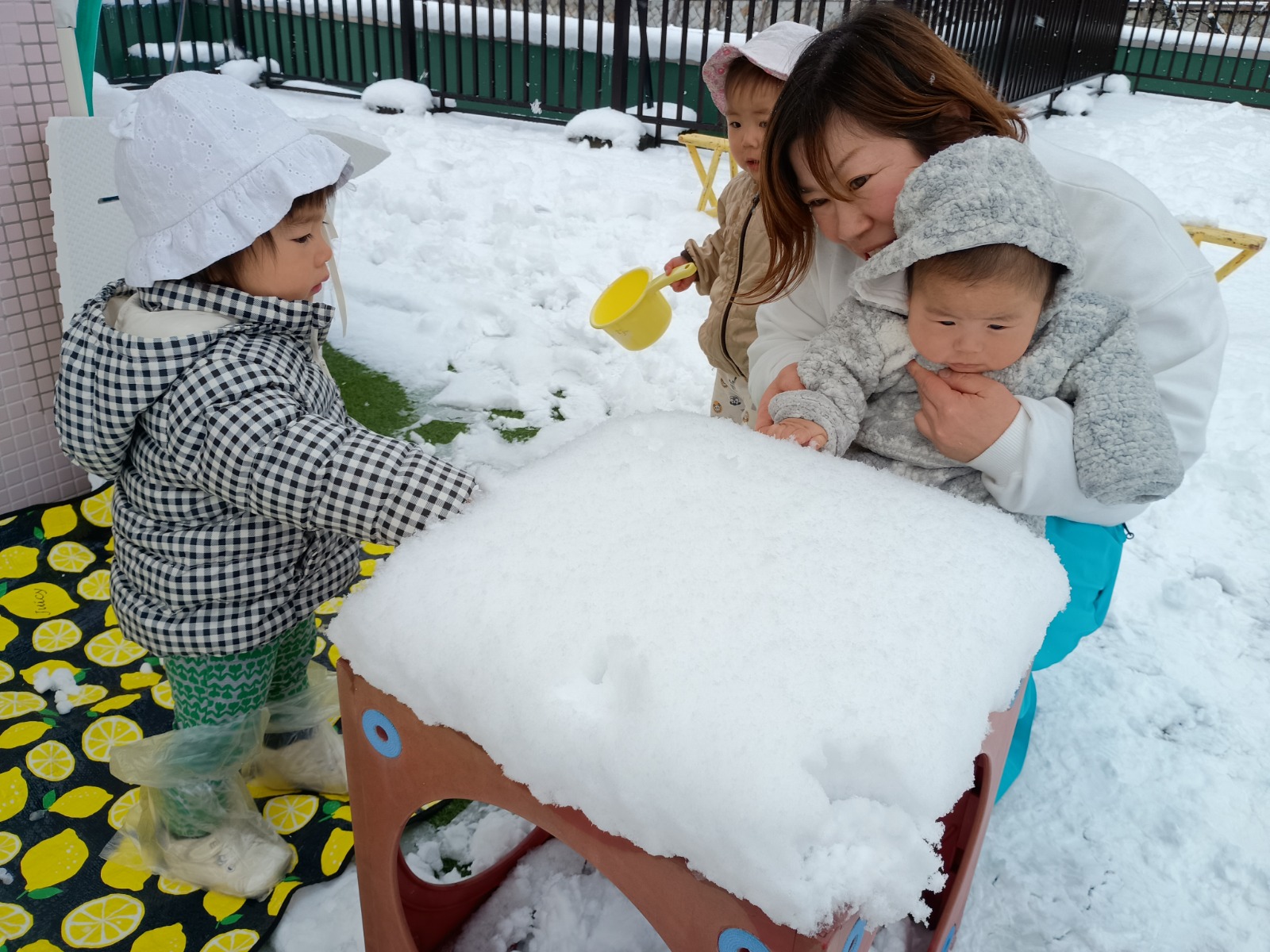 この冬2回、幼稚園にたくさんの雪がつもりました!屋上や上園庭で雪遊びをしましたよ。 足で踏みしめると「ギュッギュッ」と音がするのが面白くて、トコトコとあちこちに足跡をつけて歩いていました。 触ると冷たくてビックリしていましたが、手形をつけたり、丸めたり、振り払ったりして楽しんでいました。雪だるまを先生が作ったのをみたり、雪合戦で遊んだり、色々楽しみました。最後は冷たくて、寒くて「もうおしまい!」と終わっていました(⌒∇⌒) 冬ならではの遊びを楽しめて良かったです!