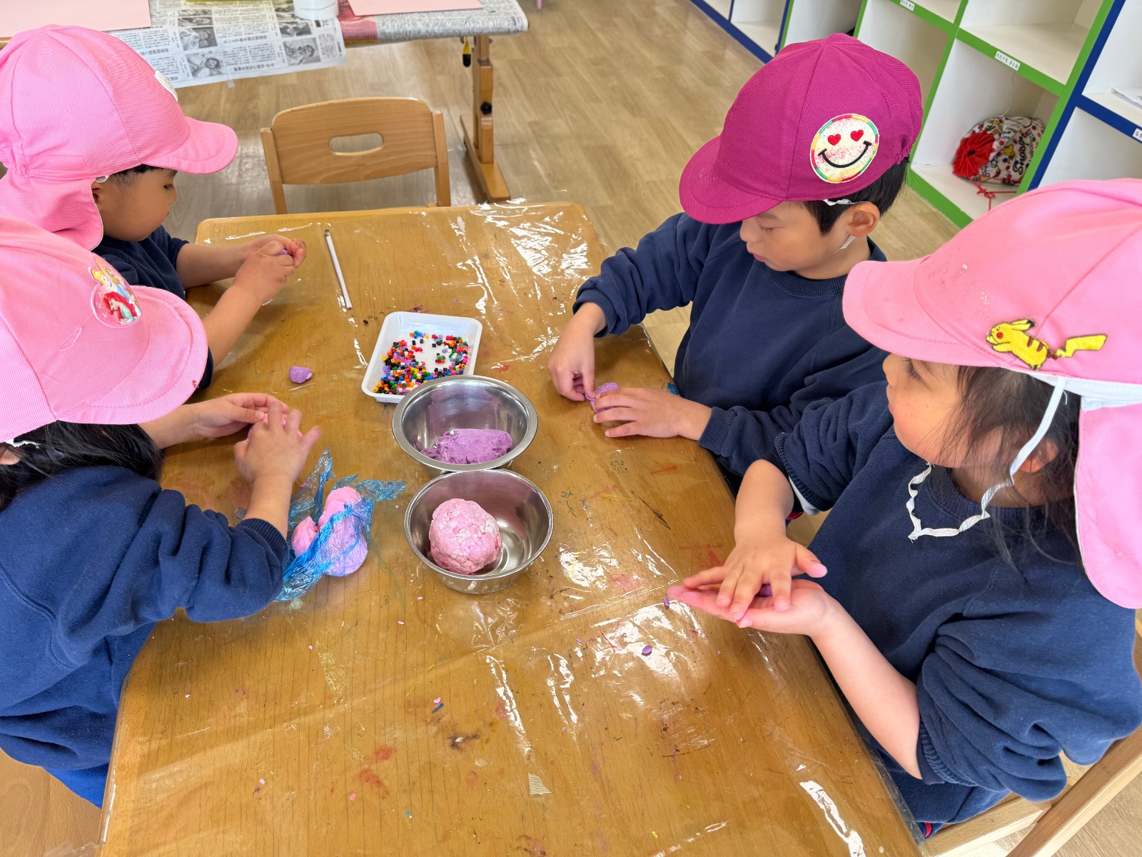 「おいしくなぁれ♪」と魔法のおまじないをかけてみる子や、黙々とこねる子など様々な作り方でとってもおもしろかったです!