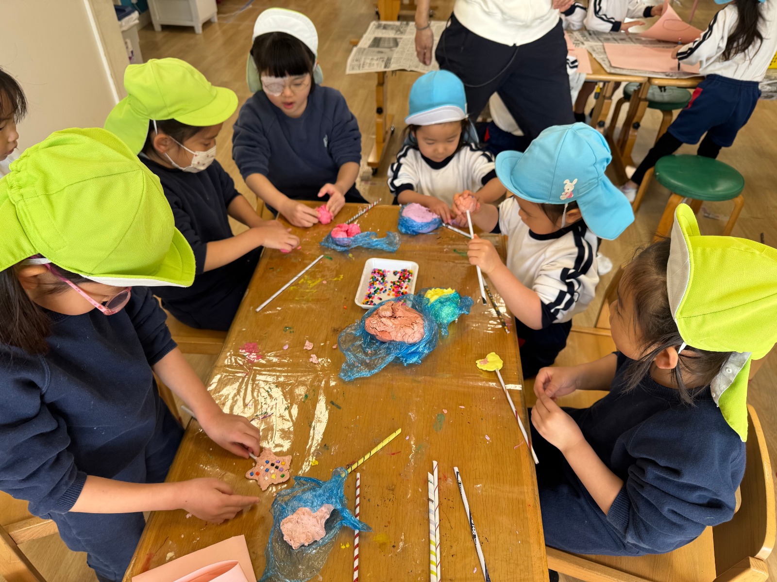 真っ白の紙粘土に、自分たちで色をつけてこねるところから始めましたよ。