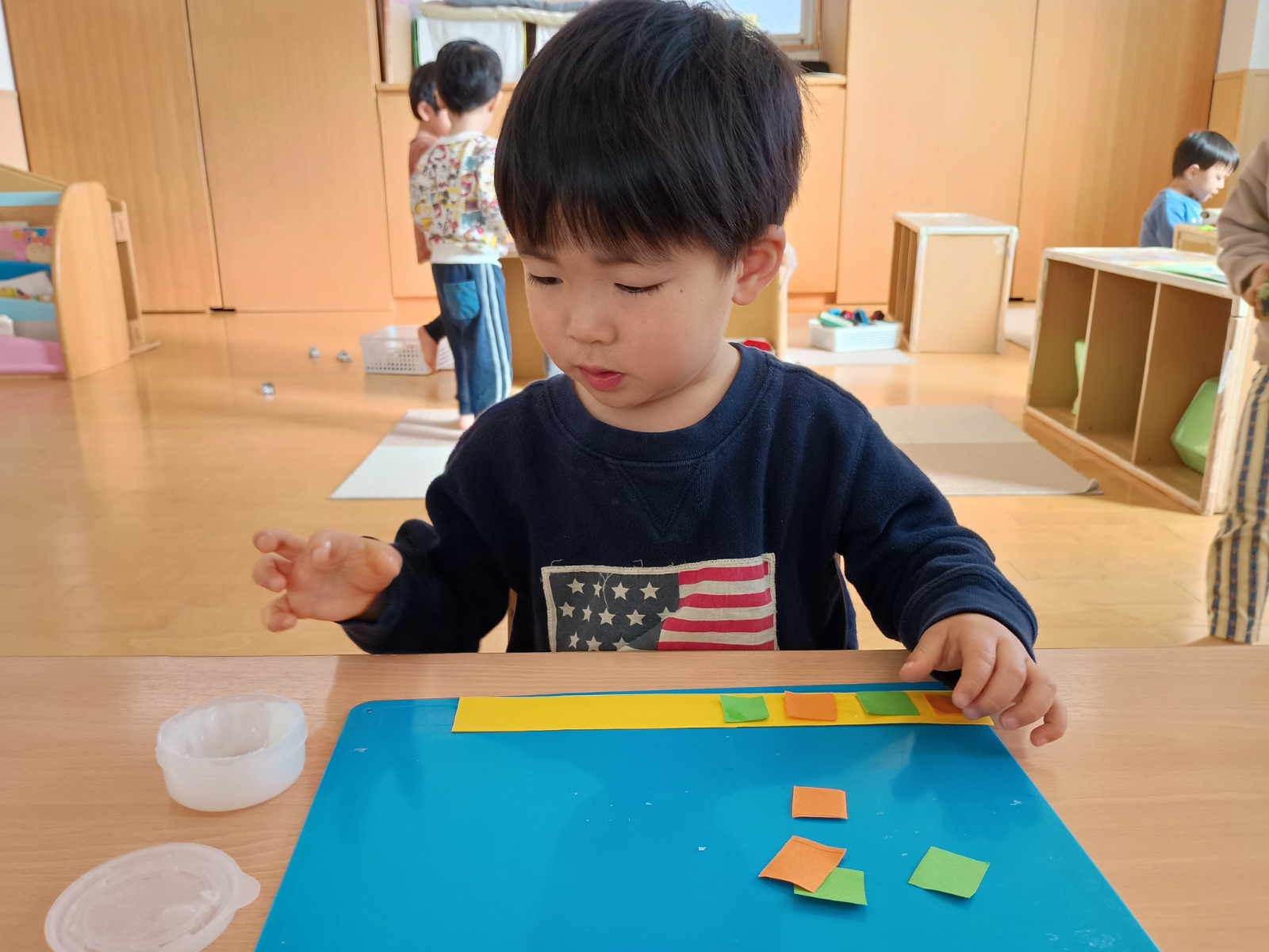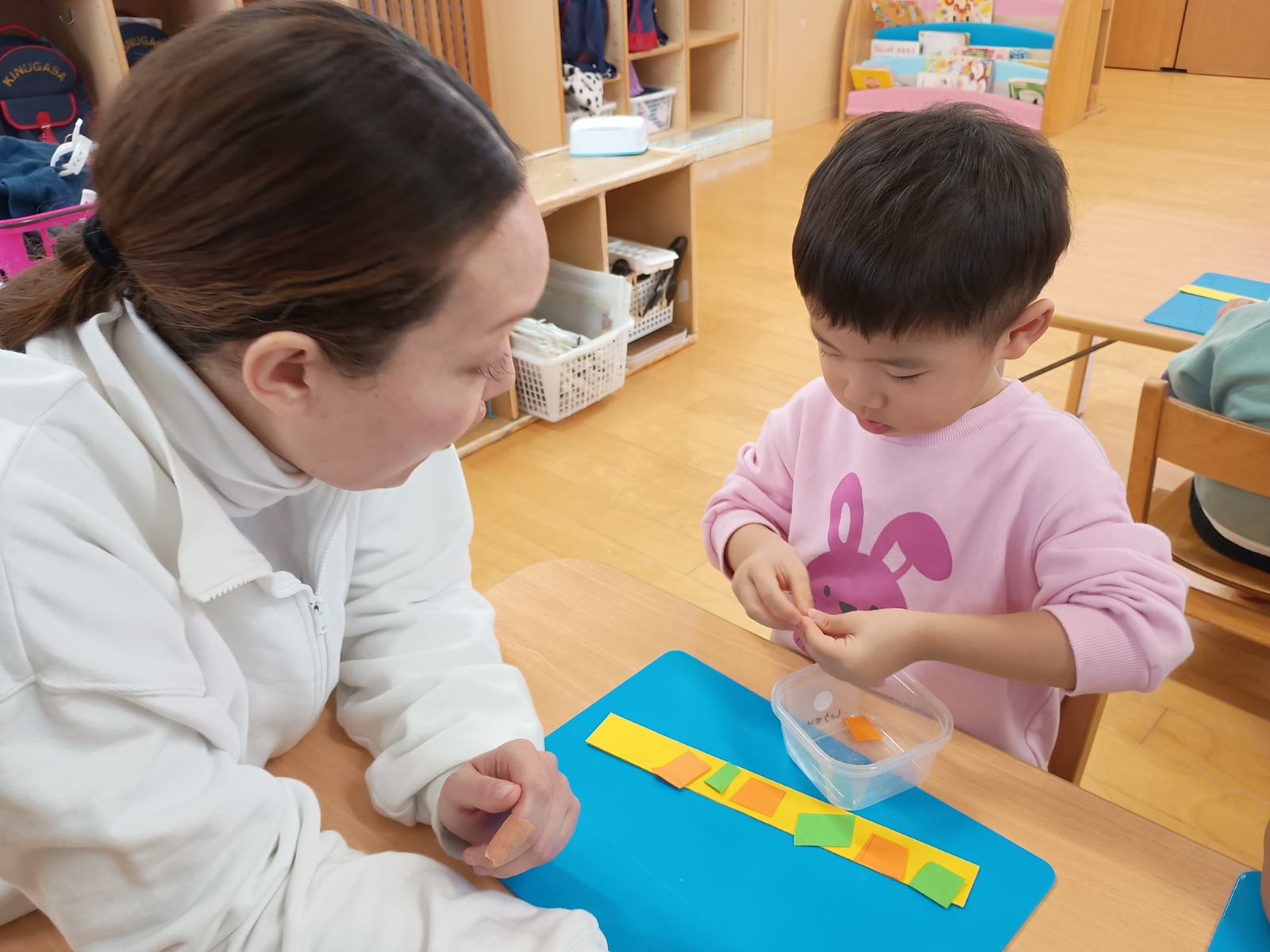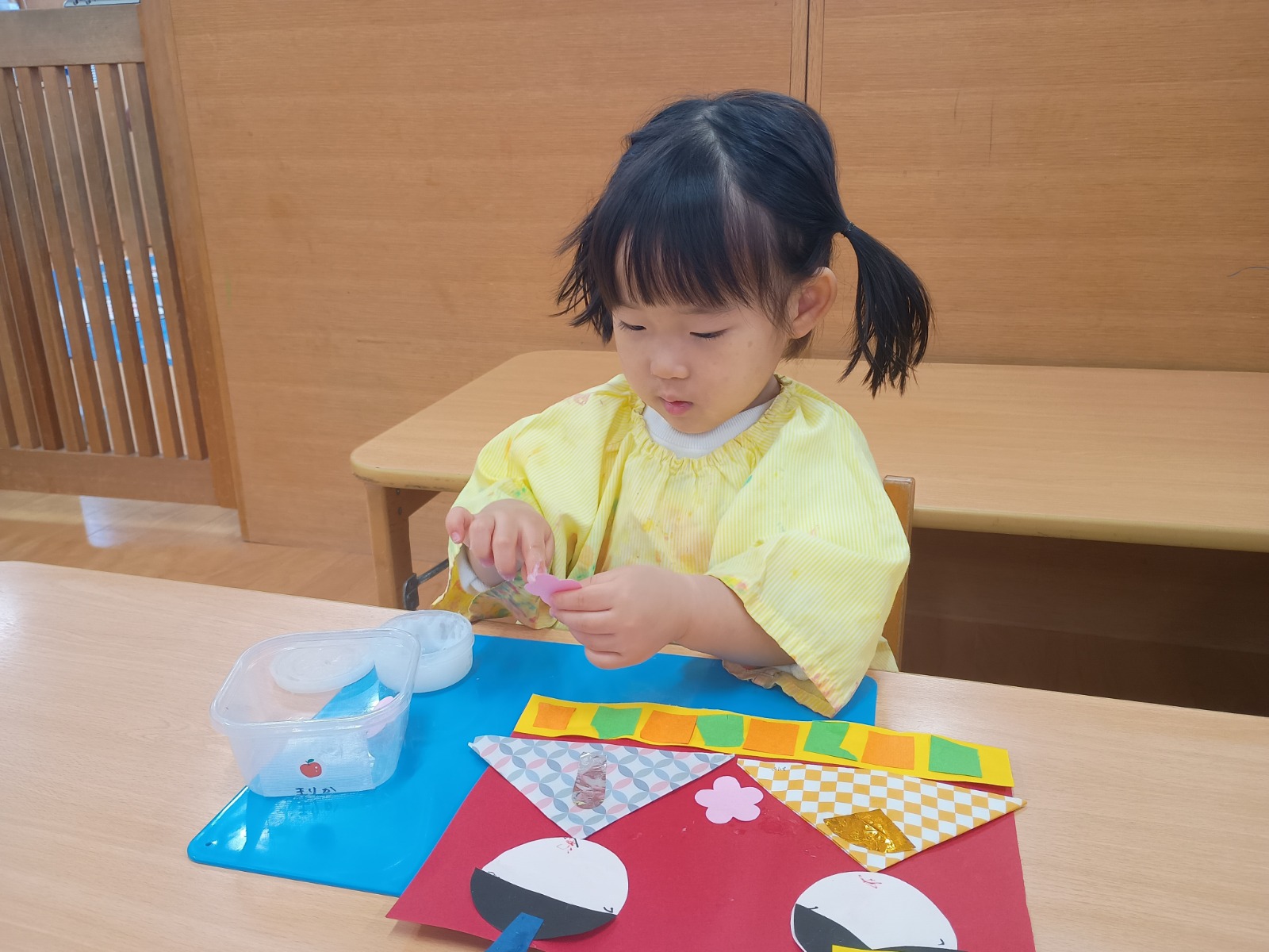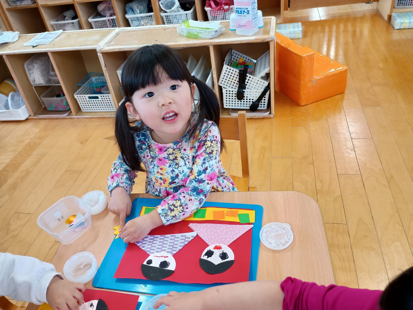 そのあとは、折り紙を三角に折って服を作ったり、顔に目と口を描いたり、糊を使って髪の毛をつけたりしました。顔のパーツの位置も、先生たちが伝えなくても分かるようになり、上手に描ける姿に成長を感じました🌟