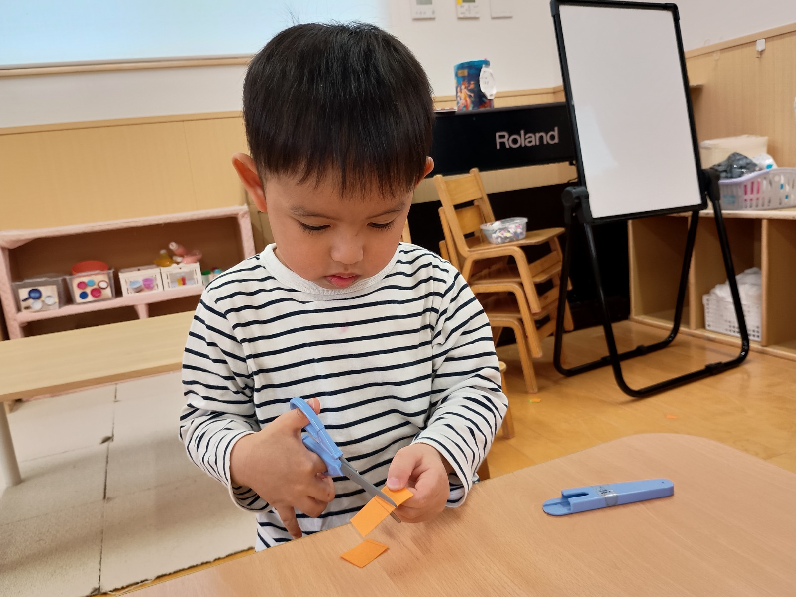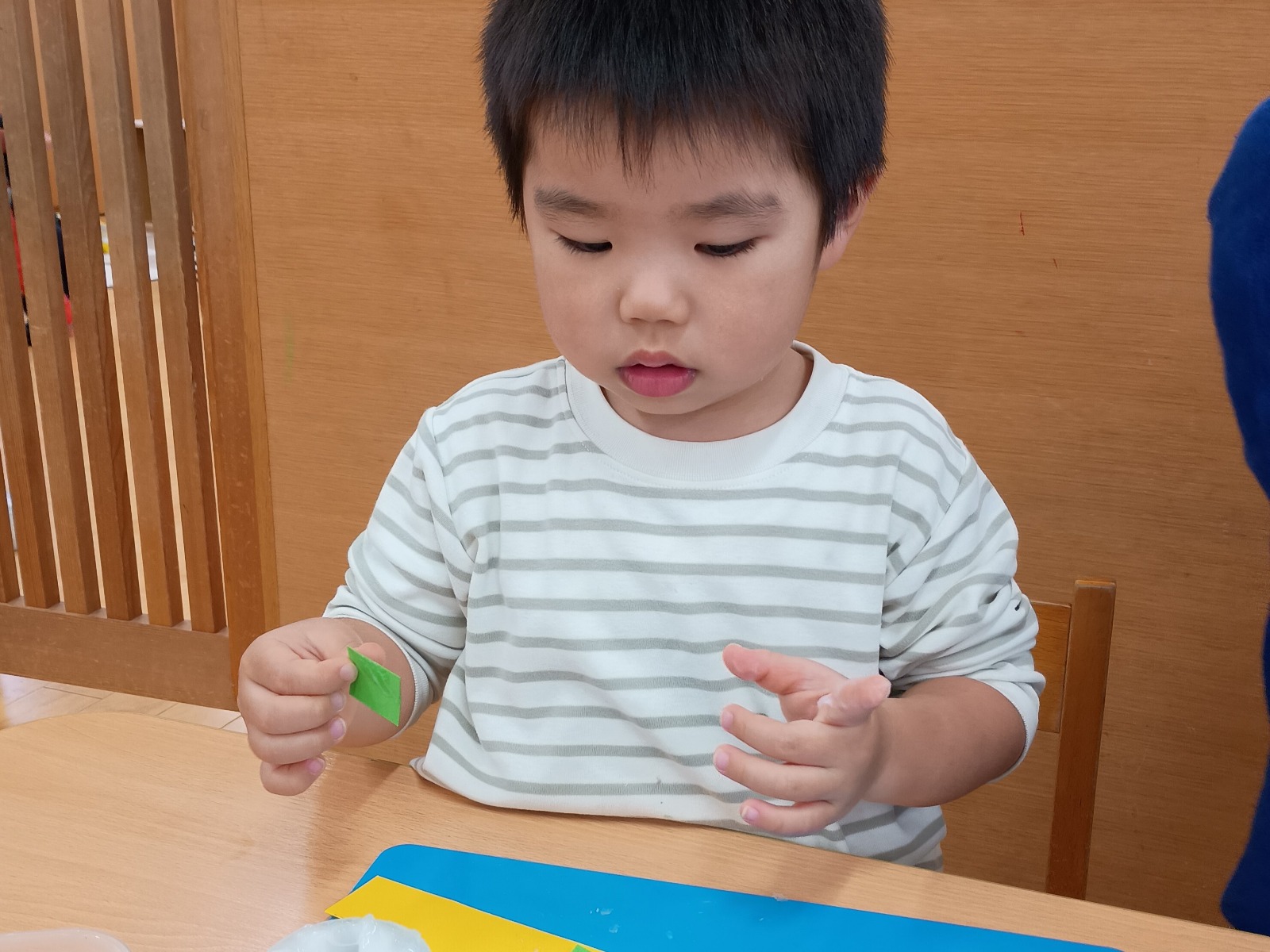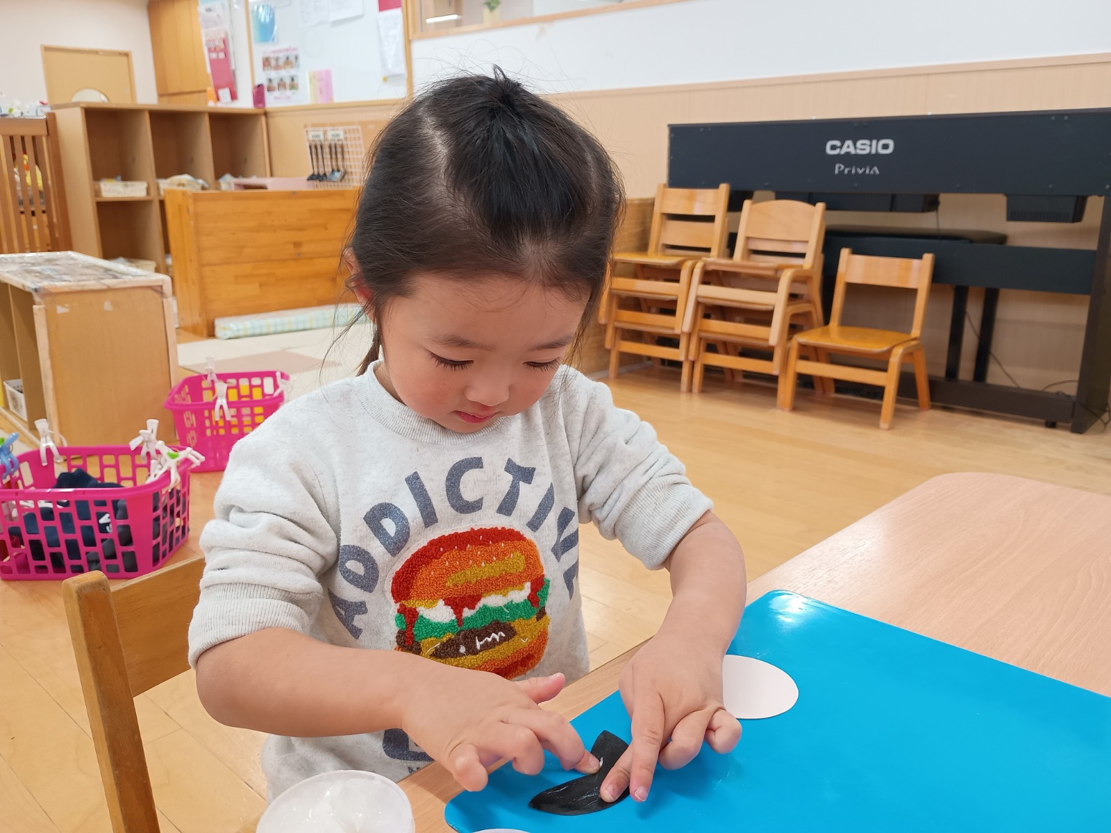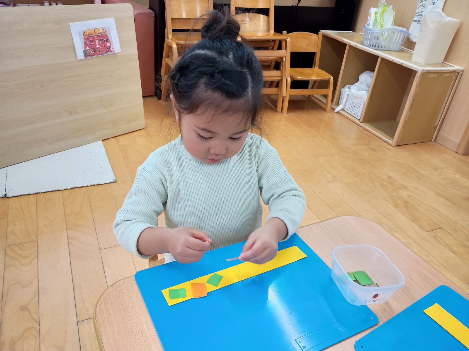 そのあとは、折り紙を三角に折って服を作ったり、顔に目と口を描いたり、糊を使って髪の毛をつけたりしました。顔のパーツの位置も、先生たちが伝えなくても分かるようになり、上手に描ける姿に成長を感じました🌟
