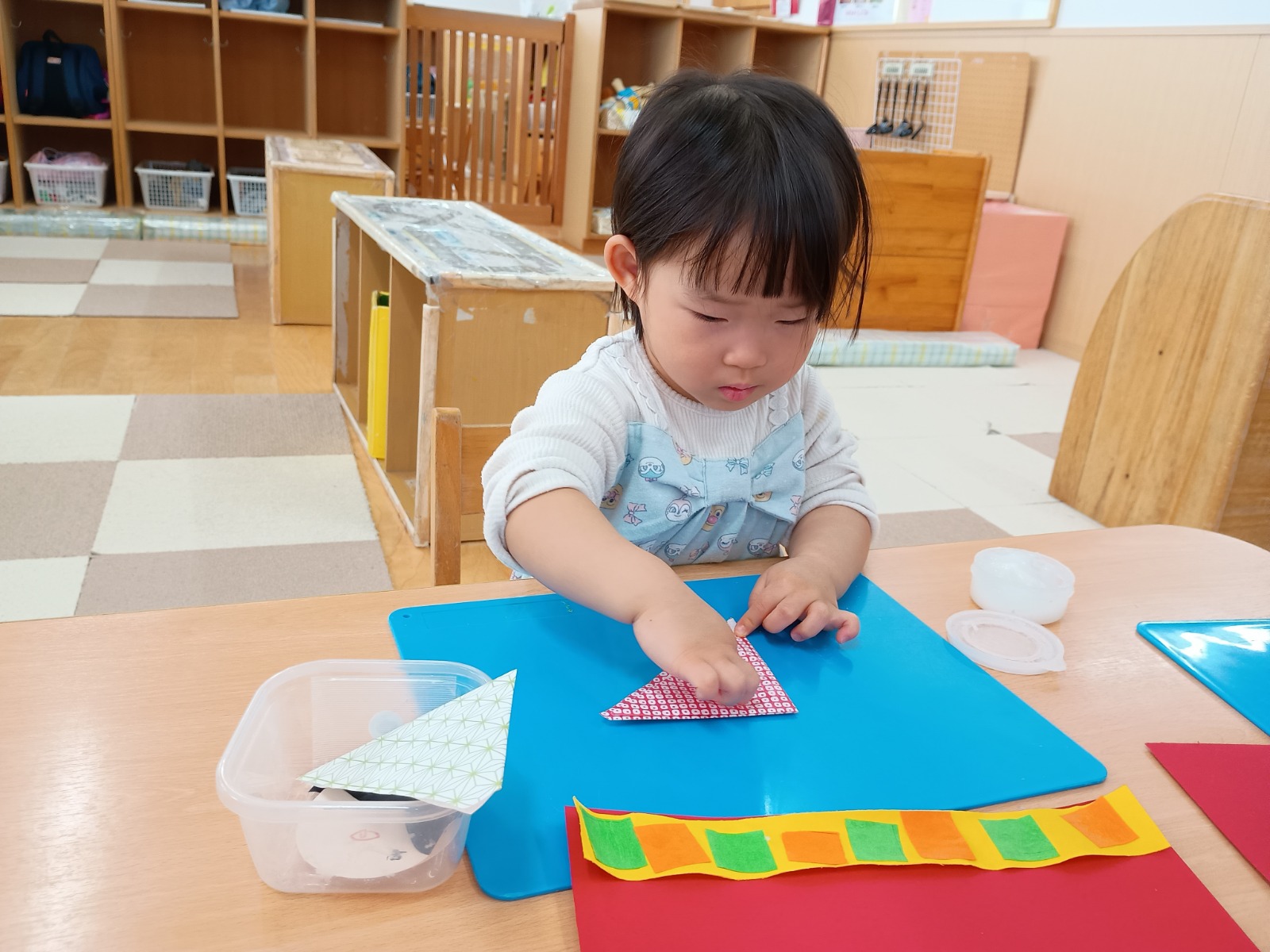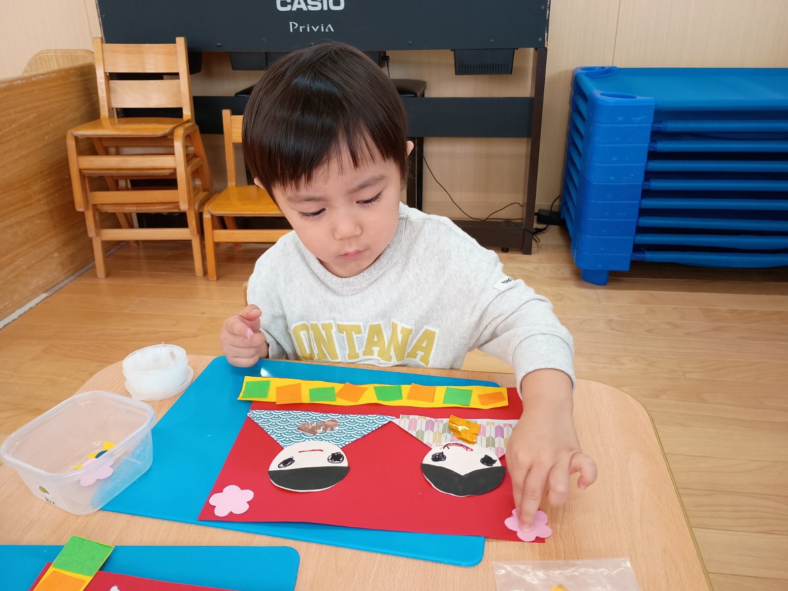 まずは、お雛様とお内裏様が座っている毛氈作りから始めました。線上切りしたオレンジと黄緑の画用紙を糊で順番に貼っていきます。黄緑→オレンジ→黄緑→オレンジと交互になるよう考えながら取り組む子どもたち。少し難しそうにしながらも、先生たちと一緒に確認しながら並べ、「できた!」と喜んでいました♪