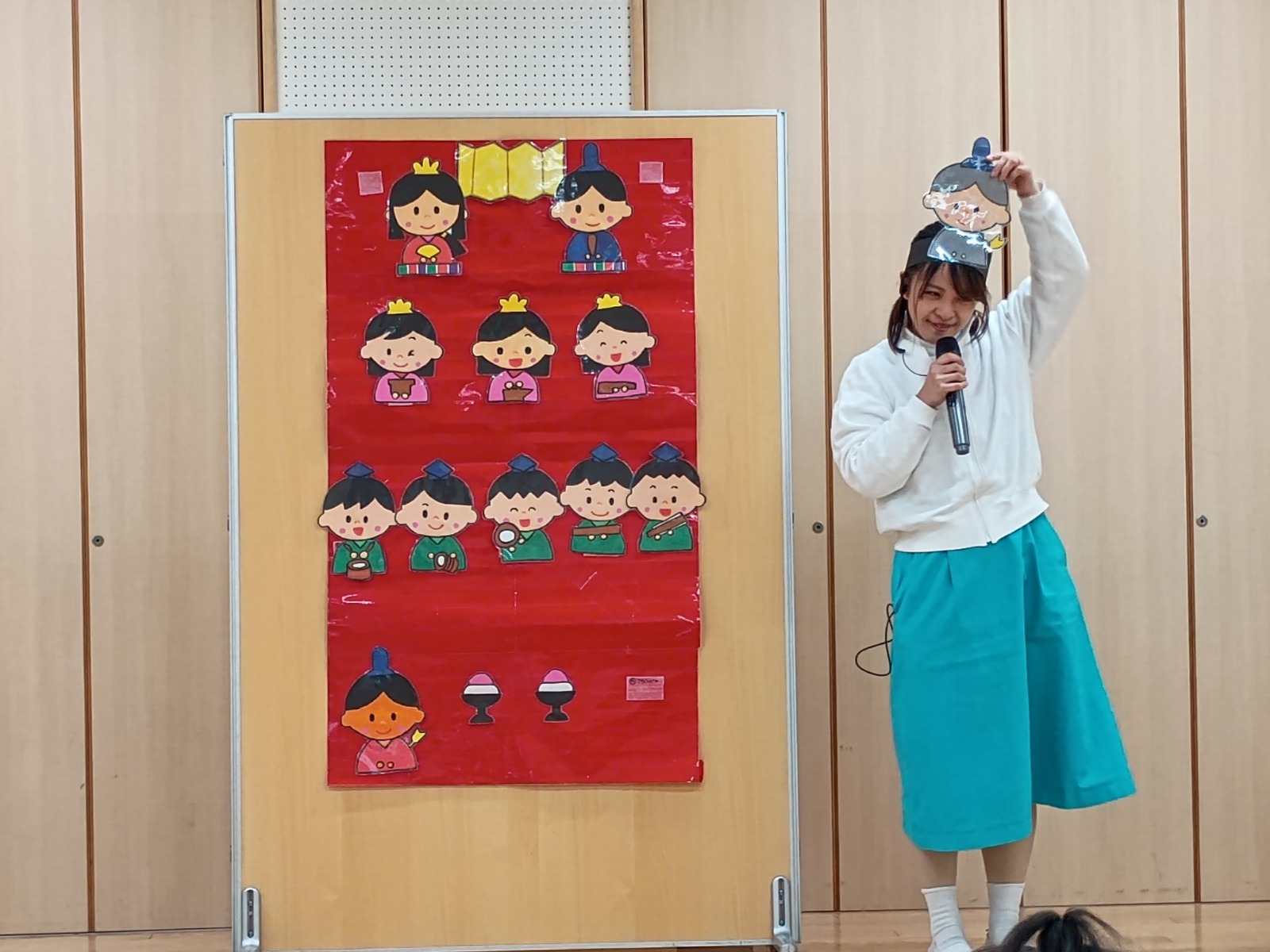 そして先生の出し物では、おだいり様やおひな様、三人官女に五人囃子、右大臣、左大臣に変身した先生が登場し、雛壇に飾り付け完成させました!!
