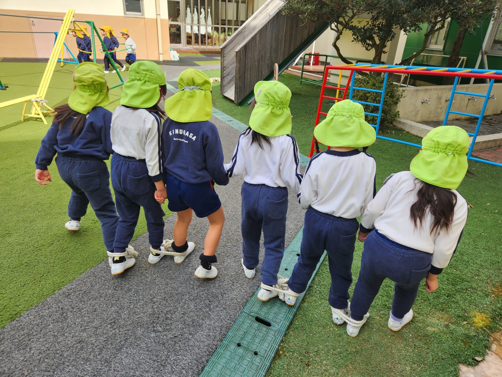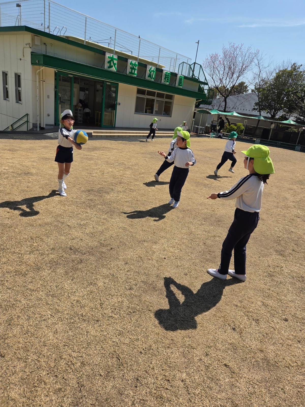 もうすぐ卒園の年長さんたちは、サッカーやドッチボール、鬼ごっこなど、ルールのある遊びを自分達でどんどん進められるようになり、身体だけでなく心の成長も大きく感じます。また、ここ最近では縄遊びに夢中になり、大繩で何回跳べるかに挑戦したり、縄で2人3脚をしてみたり、まだまだ新しい発見が続いているようです。